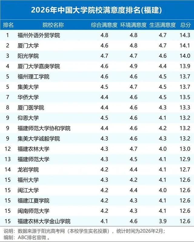 本次学生满意度调查中福州外语外贸学院综合满意度得分为4.8,环境满意度得分为4.8,生活满意度得分为4.7,总分为14.3分,位居第一。这就意味着该校学生对于校园生活的真实感受是高分。传统名校厦门大学在这次评价中排第二,总分是14.1。虽然综合满意度得分是4.6,但是它的环境与生活满意度仍然很高,分别达到了4.8和4.7,体现出其校园底蕴。阳光学院总分14.0排在第三位。厦门大学嘉庚学院、福州理工学院和集美大学也紧随其后。