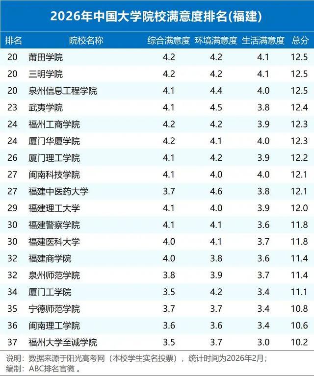 本次共有37所福建高校上榜。莆田学院、三明学院、泉州信息工程学院并列第20名。排在第27名的高校有两所,分别是闽南科技学院、福建中医药大学。福建中医药大学环境满意度得分为4.6分,为最高分。榜单的第30名附近有福建警察学院、福建医科大学等院校。福建商学院、泉州师范学院、厦门工学院等学校的排名处于比较靠后的地位。宁德师范学院、闽南理工学院、福州大学至诚学院等在最后几位。